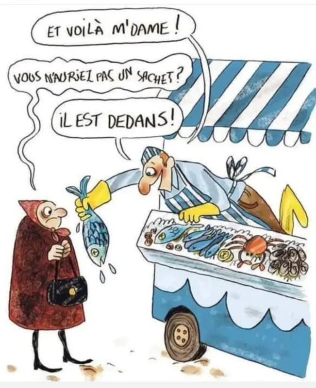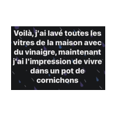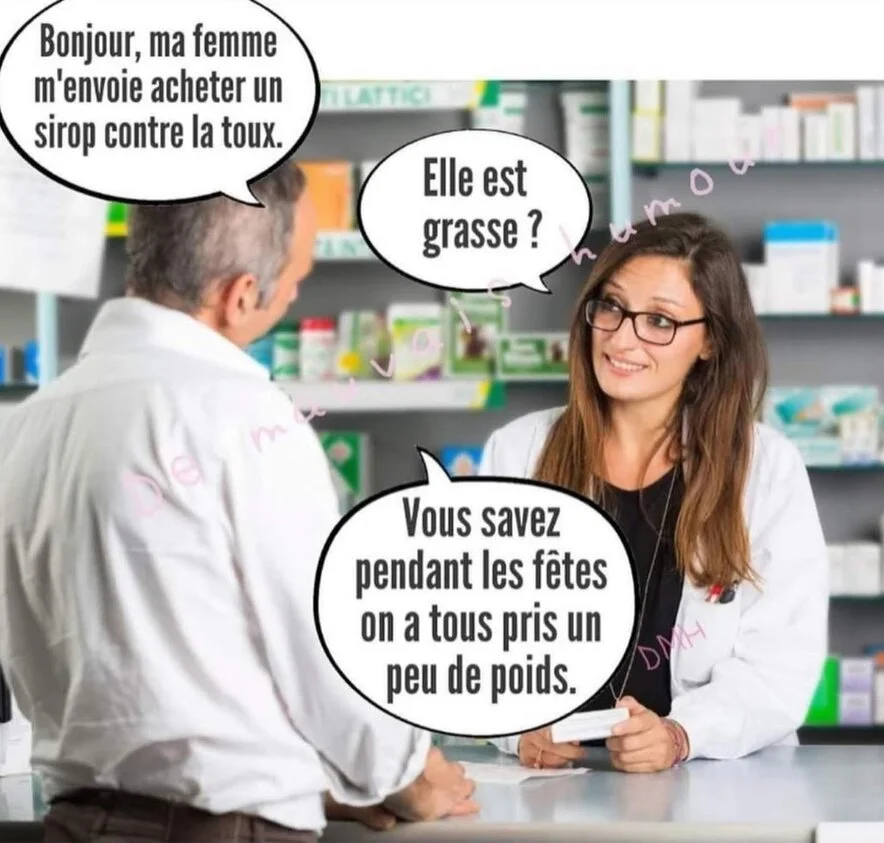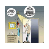 - Vous voyez le monsieur qui est à la caisse avec une moustache ? Eh bien, c'est ma femme ! Ca lui est arrivé en débouchant un flacon de ce produit avec les dents !